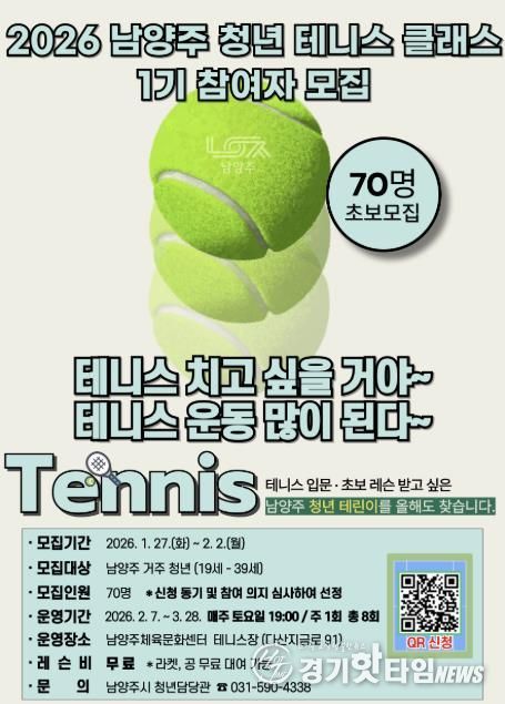 [경기핫타임뉴스=김형철 기자] 남양주시는 27일부터 내달 2일까지 ‘2026 남양주 청년 테니스 클래스 1기’ 참여자를 모집한다고 밝혔다.