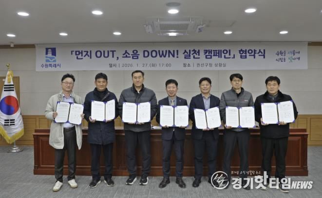 수원시 권선구는 지난 1월 27일 구청 상황실에서 관내 대형공사장 6개소와 비산먼지 및 소음 저감을 위한 ‘먼지 OUT, 소음 DOWN! 실천 캠페인’ 자율 실천 협약식을 개최했다.