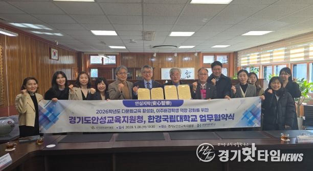 [경기핫타임뉴스=김삼영 기자] 경기도안성교육지원청은 2026년 1월 28일, 경기도안성교육지원청에서 한경국립대학교와 함께 안성 관내 다문화교육 활성화 및 이주배경학생 역량 강화를 위한 업무협약(MOU)을 체결했다.