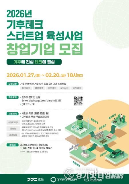 [경기핫타임뉴스=김삼영 기자] 경기도와 경기창조경제혁신센터가 기후테크 스타트업을 글로벌 유니콘기업으로 육성하기 위해 2월 20일까지 ‘기후테크 스타트업 육성 3기’ 34개 사를 모집한다.