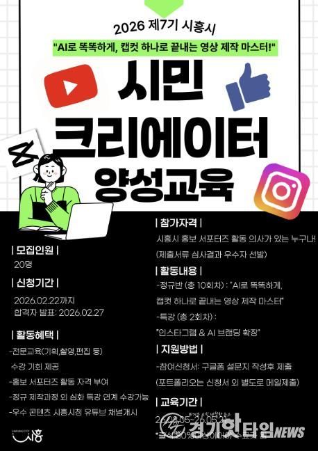 [경기핫타임뉴스=김삼영 기자] 시흥시는 시민 참여형 홍보를 활성화하고 시민이 만드는 콘텐츠를 발굴ㆍ확산하기 위해 ‘2026 제7기 시민 크리에이터(창작자) 양성 교육’을 운영하는 가운데 참가자 20명을 2월 2일부터 22일까지 모집한다.