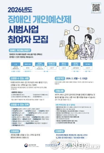 [경기핫타임뉴스=김삼영 기자] 시흥시는 2월 2일부터 13일까지 ‘2026년 장애인 개인 예산제 시범사업’ 참여자를 모집한다.