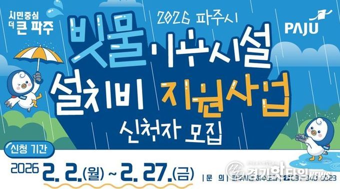 [경기핫타임뉴스=김형철 기자] 파주시는 수자원의 효율적인 활용과 기후변화 위기 대응을 위해 '2026년 빗물이용시설 설치비 지원사업’신청자를 오는 2월 2일부터 27일까지 모집한다. 지원 대상으로 선정될 경우, 설치비의 최대 90%까지 보조금이 지원된다.