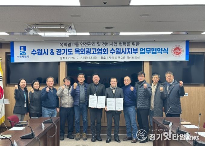 [경기핫타임뉴스=김삼영 기자] 수원특례시와 경기도 옥외광고협회 수원시지부가 2일 시청 영상회의실에서 ‘옥외광고물 안전관리 강화를 위한 업무협약’을 체결하고, 협력을 약속했다.