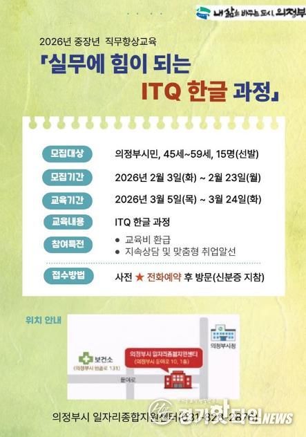 [경기핫타임뉴스=김형철 기자] 의정부시는 2026년 중장년 직무향상교육의 일환으로 ‘실무에 힘이 되는 ITQ 한글 과정’ 참여자를 모집한다.