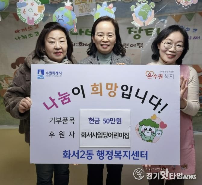 화서사임당어린이집은 지난 2일, 원아들과 학부모, 교직원이 함께 진행한 바자회 수익금 50만 원을 어려운 이웃을 위해 사용해 달라며 화서2동 행정복지센터에 기부했다.