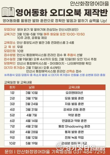 [경기핫타임뉴스=김삼영 기자] 안산시가 설립하고 안산대학교가 운영하는 안산화정영어마을이 성인 영어 학습자를 위한 ‘영어동화 오디오북 제작반’을 3월부터 5월까지 10주 과정으로 안산시 중앙도서관에서 운영한다고 4일 밝혔다.