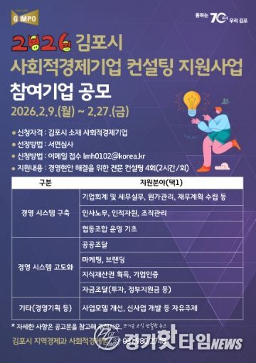 [경기핫타임뉴스=김형철 기자] 김포시가 관내 사회적경제기업의 지속 가능한 성장과 자생력 강화를 위해 ‘사회적경제기업 역량강화 컨설팅 지원사업’ 참여기업을 오는 2월 27일까지 모집한다.