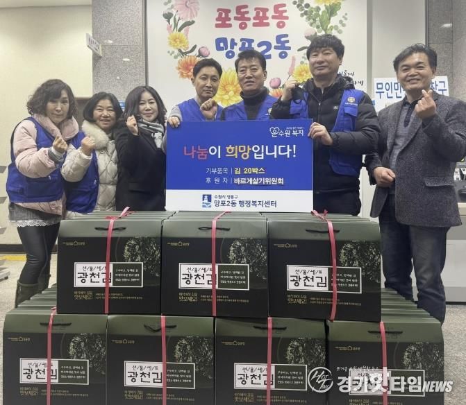 [경기핫타임뉴스=김삼영 기자] 영통구 망포2동 행정복지센터는 지난 6일 망포2동 바르게살기위원회가 관내 저소득 가정을 지원하기 위해 김 20박스를 기탁했다고 밝혔다.