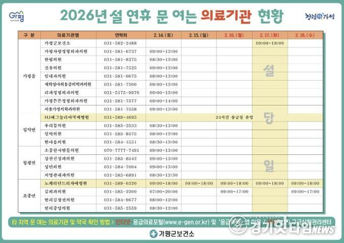 아울러 가평군은 설 연휴 동안 운영하는 의료기관, 약국 정보를 사전에 안내하고 있다. 연휴 기간 문을 여는 의료기관 및 약국 정보는 △가평군청 및 가평군보건소 홈페이지 △119구급상황관리센터 △응급의료포털 △보건복지콜센터에서 확인할 수 있다.