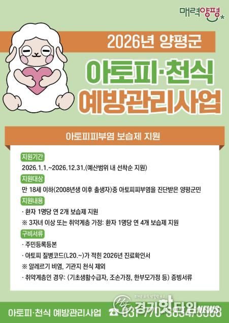 [경기핫타임뉴스=김형철 기자] 양평군은 지역사회 중심의 알레르기질환 조기 발견과 적절한 치료를 위해 양평군민을 대상으로 2026년 연중 ‘아토피피부염 보습제 지원’과 ‘취약계층 알레르기질환 의료비 지원’ 사업을 추진한다고 밝혔다.