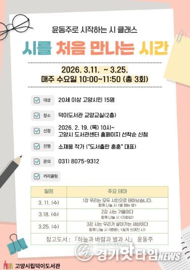 [경기핫타임뉴스=김형철 기자] 고양특례시 덕이도서관은 시민들에게 시를 통해 자신의 내면을 성찰하고 감성을 키울 수 있는 프로그램‘시를 처음 만나는 시간'을 운영한다.