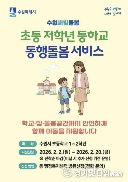 [경기핫타임뉴스=김삼영 기자] 수원특례시가 ‘초등 저학년 등하교 동행돌봄서비스’ 사전 신청 기간을 운영한다.