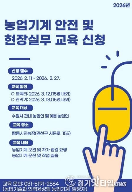 [경기핫타임뉴스=김삼영 기자] 수원특례시는 ‘2026년 농업기계 안전 및 현장실무 교육’ 수강생을 2월 27일까지 모집한다. 관내 (예비)농업인이 참여할 수 있다.
