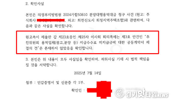 또한 창립총회 당시 서면결의 방식이 악용돼 조합원들이 후보자와 안건을 충분히 인지하지 못한 채 동의 절차가 진행됐다는 주장도 제기되면서, 향후 총회 효력 정지 가처분 등 법적 분쟁으로 이어질 가능성도 거론된다.