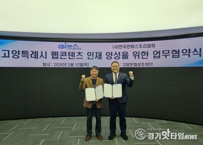 [경기핫타임뉴스=김형철 기자] 고양산업진흥원이 지난 12일 고양문화창조허브에서 한국만화스토리협회와 웹툰·웹소설 분야 전문 인재 양성을 위한 업무협약을 체결했다.