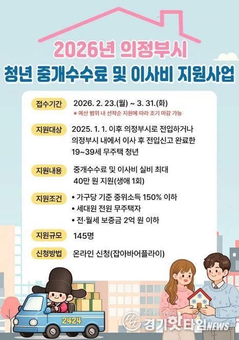 [경기핫타임뉴스=김형철 기자] 의정부시는 청년들의 주거 이전 비용 부담을 줄이기 위한 ‘2026년 청년 중개수수료 및 이사비 지원사업’의 신청자를 모집한다.