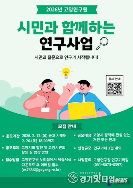 [경기핫타임뉴스=김형철 기자] 고양연구원은 시민과 함께 고양시의 미래를 설계하는 문제해결형 연구를 추진하기 위해 ‘시민과 함께하는 연구사업’ 공개 모집을 오는 2월 26일까지 진행한다.