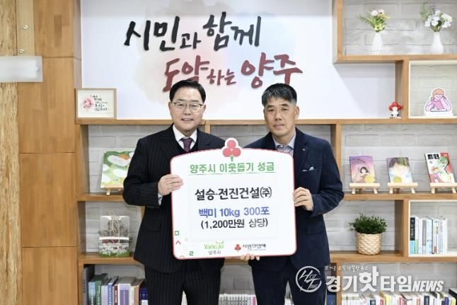 [경기핫타임뉴스=김형철 기자] 양주시가 최근 전진건설㈜·설승건설㈜로부터 이웃돕기 성품으로 백미 10kg 300포(1,200만 원 상당)를 기탁받았다고 밝혔다.
