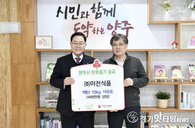 [경기핫타임뉴스=김형철 기자] 양주시는 최근 ㈜미진식품로부터 이웃돕기 성품으로 백미 10kg 100포(400만 원 상당)를 기탁받았다고 밝혔다.
