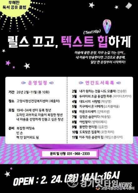 [경기핫타임뉴스=김형철 기자] 고양시정신건강복지센터는 만19~34세 등록청년을 대상으로 ‘무해한 독서 공유 클럽’(릴스 끄고, 텍스트 힙하게)을 매달 운영한다.