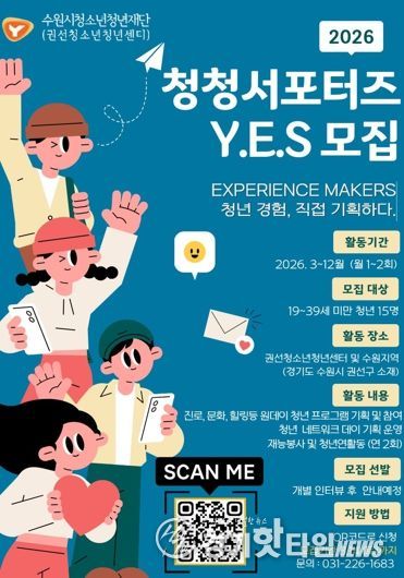 [경기핫타임뉴스=김삼영 기자] 수원시청소년청년재단 권선청소년청년센터는 청년이 문화 프로그램의 기획과 운영 과정에 주도적으로 참여하며 또래 간 네트워크를 형성하고, 이를 통해 지역사회에 긍정적인 에너지를 확산할 수 있도록 돕는 '2026 청청서포터즈 YES(Youth Energy Supporters)' 참가자를 모집한다.