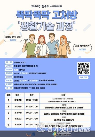 [경기핫타임뉴스=김삼영 기자] 시흥시주거복지센터는 시민이 직접 집 관리와 수리 방법을 익혀 스스로 주거 환경을 개선할 수 있도록 2026년 집수리 아카데미 ‘뚝딱뚝딱 고쳐방’ 생활기술 과정 교육생을 10명 모집한다.