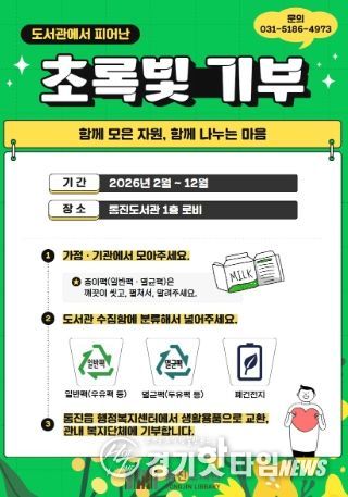 [경기핫타임뉴스=김형철 기자] 김포시 통진도서관은 2월부터 12월까지 시민들과 함께 환경을 보호하고 소외된 이웃을 돕는 자원순환 나눔 프로그램 ‘도서관에서 피어난 초록빛 기부’를 운영한다고 밝혔다.