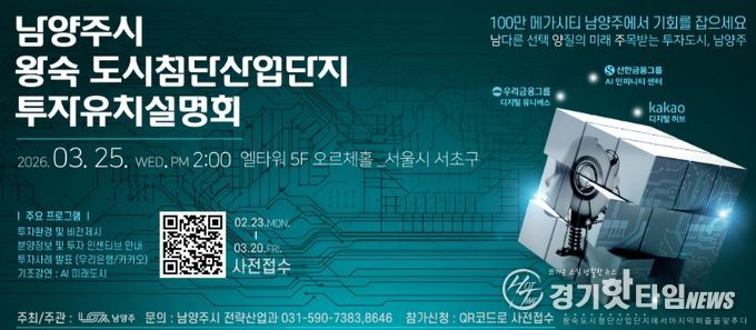 [경기핫타임뉴스=김형철 기자] 남양주시는 오는 3월 25일 서울 서초구 엘타워 오르체홀에서 ‘남양주시 왕숙 도시첨단산업단지 투자유치설명회’를 개최하며, 이에 앞서 3월 20일까지 참여 희망 기업을 대상으로 사전접수를 진행한다고 밝혔다.
