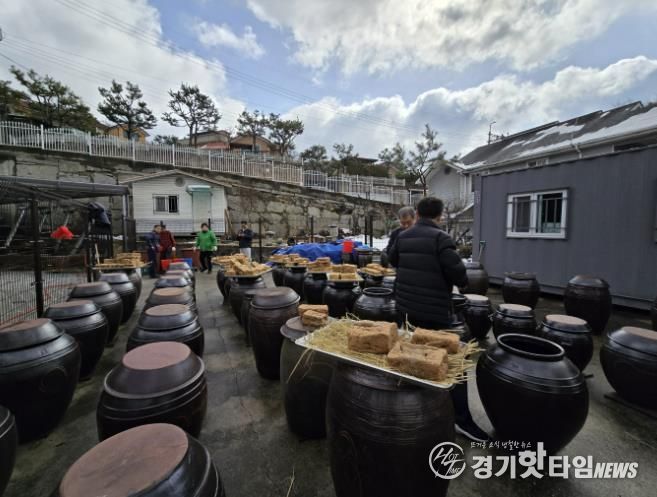 이번 행사는 예로부터 장을 담그기에 가장 좋고 부정이 없다고 전해지는 길일인 음력 1월 ‘말날(午日)’을 택해 진행돼 의미를 더했다. 이날 사용된 메주는 2025년 주민자치회 위원들이 우리 콩으로 직접 띄우고 말린 것으로, 숯 등으로 소독한 장독에 메주와 소금물을 붓는 전통 방식을 재현했다.