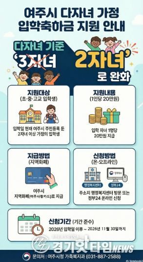 [경기핫타임뉴스=김형철 기자] 여주시는 저출산 극복과 양육 부담 경감을 위해 다자녀 가정 기준을 3자녀 이상에서 2자녀 이상으로 확대하고 오는 3월부터 다자녀 가정 입학축하금 지원 신청을 받는다고 밝혔다.