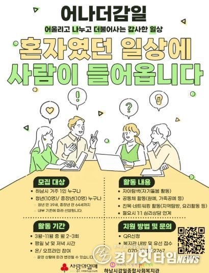 [경기핫타임뉴스=김형철 기자] 하남시감일종합사회복지관(사회복지법인 휴먼복지회 운영)은 2026년 1월부터 12월까지 1인 가구의 사회적 관계망 형성과 지역사회 참여 확대를 위한 특화사업 '어나더 감일(어울리고 나누고 더불어사는 감사한 일상)'을 운영하며 이에 참여할 대상자를 모집한다.