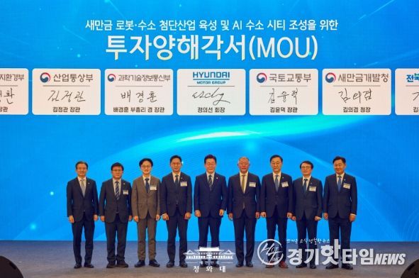 [경기핫타임뉴스=김삼영 기자] 이재명 대통령은 27일 새만금 로봇·수소·AI 시티 투자 협약식에 참석해 "현대자동차그룹의 혁신 역량 그리고 풍부한 자원이 합쳐진다면 새만금은 최적의 시너지를 발휘하는 기회의 땅이 될 수 있을 것으로 믿는다"고 밝혔다.