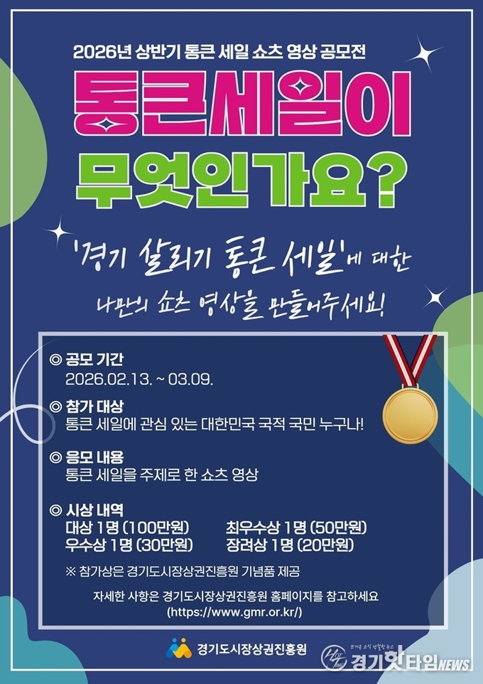 [경기핫타임뉴스=김삼영 기자] 경기도시장상권진흥원(이하 경상원)이 2월 13일부터 3월 9일까지 총 상금 200만 원 규모의 ‘2026년 상반기 통큰 세일 쇼츠 영상 공모전 - 통큰 세일이 무엇인가요?’를 개최한다.