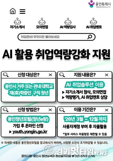 [경기핫타임뉴스=김삼영 기자] 용인특례시는 인공지능(AI)을 활용한 취업역량강화 지원사업에 참여할 청년 구직자를 모집한다고 2일 밝혔다.
