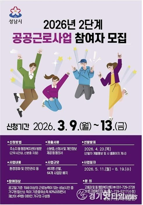 [경기핫타임뉴스=김삼영 기자] 성남시는 오는 3월 9일부터 13일까지 ‘2026년도 2단계 공공근로사업’ 참여 희망자 463명을 모집한다.