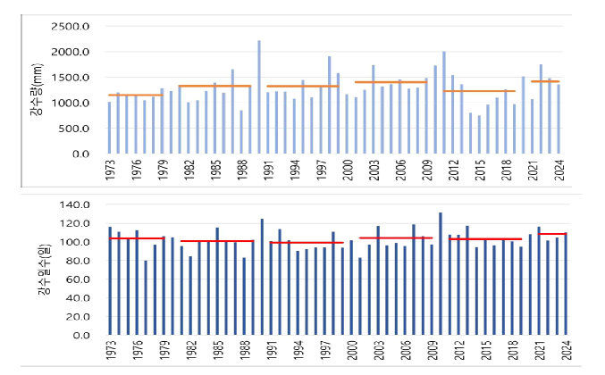 강수량 변화에 있어서도 지난 52년간 연강수량은 증가(매 10년당 +30.49mm)하고 연강수일수도 증가(매 10년당 +0.87일)하면서, 강수강도, 호우일수 역시 뚜렷한 증가 추세를 보여 집중호우가 빈번해지는 것으로 나타났으며, 계절별로 강수량은 여름철과 가을철에 증가, 강수일수는 겨울철에 감소하는 경향인 것으로 분석됐다.