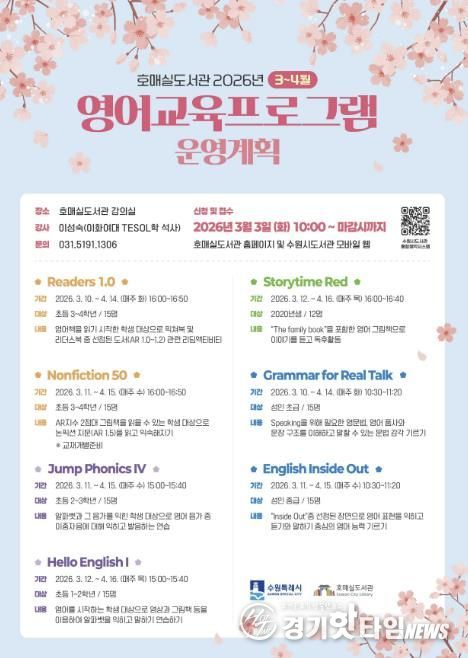 [경기핫타임뉴스=김삼영 기자] 수원시 호매실도서관이 ‘3~4월 영어교육 프로그램’ 참가자를 모집한다. 이성숙 강사(이화여대 테솔(TESOL)학 석사)가 강의한다.