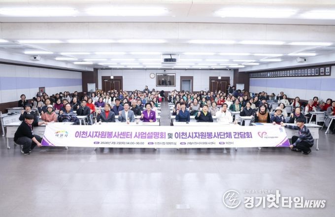 [경기핫타임뉴스=김형철 기자] 이천시자원봉사센터는 3월 3일 시청 대회의실에서 김경희 이천시장, 박명서 이천시의회 의장을 비롯한 자원봉사자 180여 명이 참석한 가운데 ‘2026년도 사업설명회 및 자원봉사단체 간담회’를 개최했다.