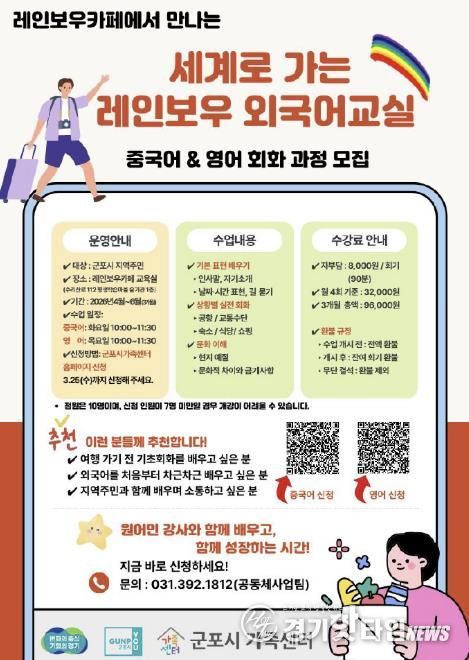 [경기핫타임뉴스=김삼영 기자] 군포시가족센터는 군포시민을 위한 실생활 외국어 회화 프로그램 ‘세계로 가는 레인보우 외국어교실’을 오는 4월부터 레인보우카페 교육실에서 운영한다.