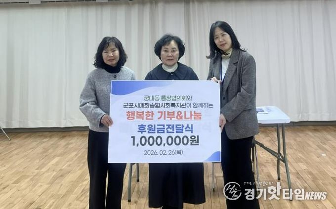 [경기핫타임뉴스=김삼영 기자] 군포시 궁내동통장협의회는 지난 2월 26일 매화종합사회복지관에 후원금 100만원을 전달했다.