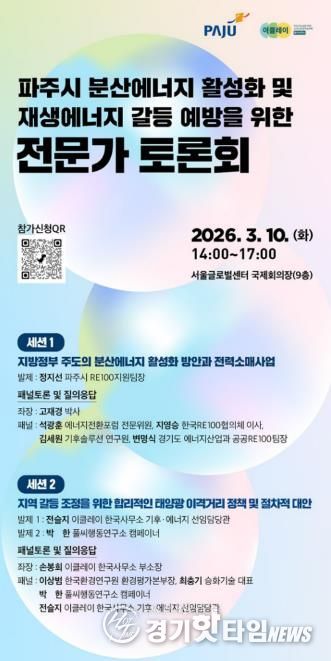 [경기핫타임뉴스=김형철 기자] 파주시는 이클레이(ICLEI) 한국사무소와 함께 오는 10일 서울글로벌센터 국제회의장에서 ‘분산에너지 활성화 및 재생에너지 갈등 예방을 위한 전문가 토론회’를 개최한다.