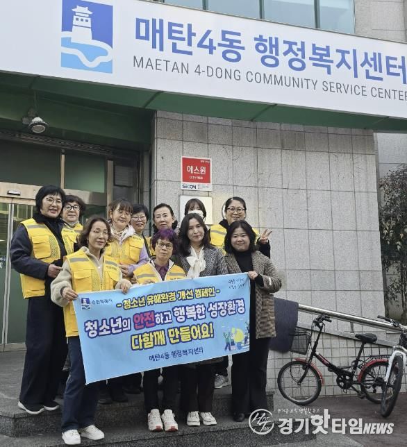 [경기핫타임뉴스=김삼영 기자] 영통구 매탄4동 행정복지센터는 지난 4일 청소년지도위원 및 관계 공무원 등 11명이 참여해 청소년 유해환경 지도·단속 캠페인을 실시했다고 밝혔다.