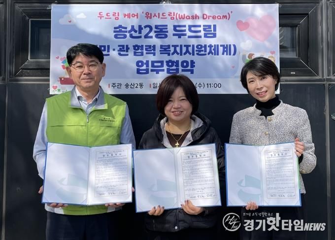 [경기핫타임뉴스=김형철 기자] 의정부시 송산2동주민센터는 3월 4일 QUEEN크린셀프빨래방, 송산2동 지역사회보장협의체와 취약계층 세탁지원을 위한 두드림(민관 협력 복지지원체계) 케어 ‘워시드림(Wash Dream)’ 사업 업무협약을 체결했다.