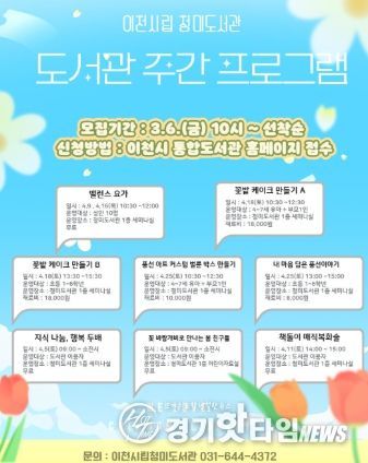 [경기핫타임뉴스=김형철 기자] 이천시 청미도서관에서는 오는 4월 1일부터 30일까지 제62회 도서관 주간을 맞아 ‘도서관 속 작은 펼침, 세상을 여는 큰 열림’이라는 주제로 시민들이 즐길 수 있는 체험, 공연, 전시 프로그램을 운영한다.