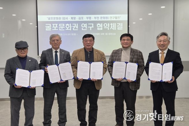 [경기핫타임뉴스=김형철 기자] 부천문화원과 강서문화원, 계양문화원, 김포문화원, 부평문화원은 3월 4일 부천문화원에서 ‘굴포문화권’을 토대로 하는 연구교류 협약식을 체결했다. 이로써 ‘굴포’를 같은 문화권으로 하는 부천문화원·강서문화원·계양문화원·김포문화원·부평문화원은 학술대회와 콘텐츠 발굴 사업 등 다양한 지역학 자원을 발굴하고 활성화하기 위해 최초로 지역학 연구 모델을 구축하게 됐다. 특히, 이번 협약은 경기도(부천, 김포), 서울특별시(강서), 인천광역시(계양, 부평)를 잇는 ‘지역학’ 중심의 연구 교류를 마련한다는 점에서 주목된다.