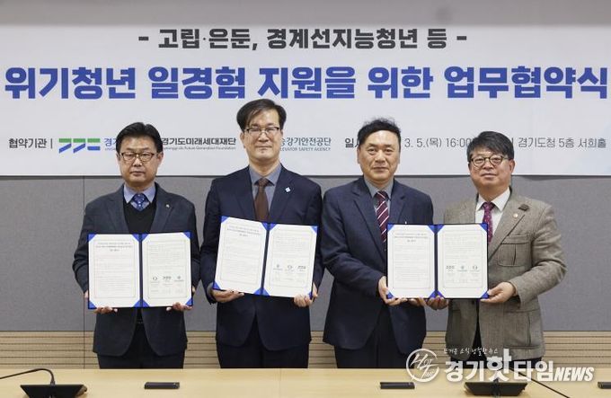 [경기핫타임뉴스=김삼영 기자] 경기도와 경기도미래세대재단, 한국승강기안전공단 경인지역본부는 5일 경기도청 서희홀에서 ‘위기청년 일경험 지원을 위한 업무협약’을 체결했다.