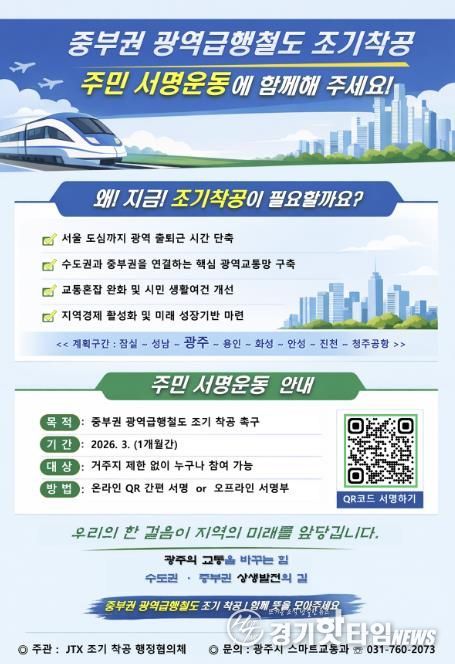 [경기핫타임뉴스=김삼영 기자] 광주시는 중부권 광역급행철도의 조기 착공을 촉구하기 위해 3월 한 달간 주민 서명운동을 한다고 6일 밝혔다.