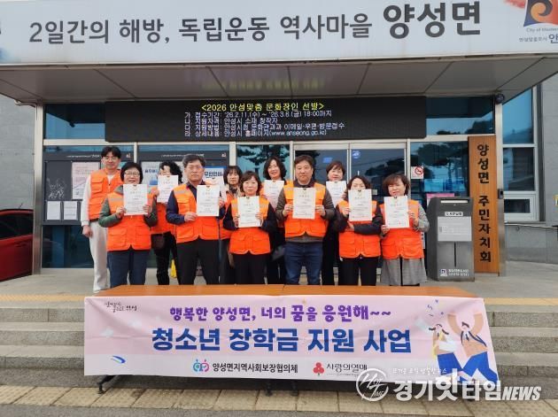‘청소년 장학금 지원 사업’은 양성면 아동‧청소년이 건강하게 성장하고 미래에 대한 희망을 키울 수 있도록 돕기 위해 추진되고 있으며, 이번 지원으로 11명에게는 2026년 3월부터 12월까지 매월 10만 원씩(총 100만 원), 2명에게는 2027년 2월까지 매월 10만 원씩(총 120만 원) 지원하며, 총 13명에게 1,440만 원의 장학금이 전달될 예정이다.