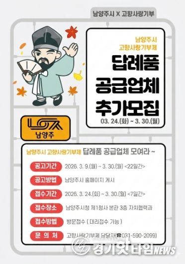 [경기핫타임뉴스=김형철 기자] 남양주시는 오는 3월 24일부터 고향사랑기부제 참여자들에게 제공할 ‘2026년 고향사랑기부제 답례품 공급업체’ 추가 모집 접수를 시작한다고 6일 밝혔다.
